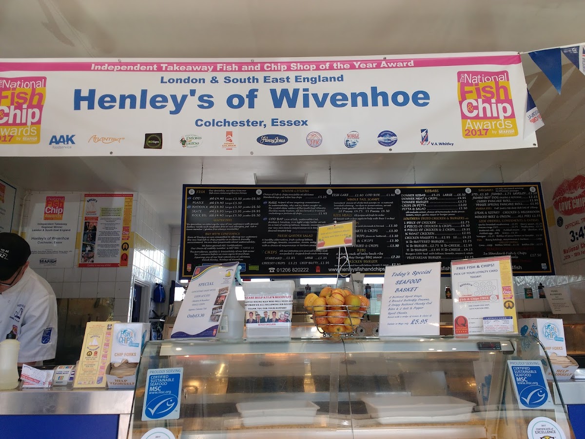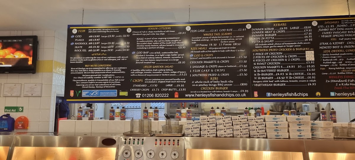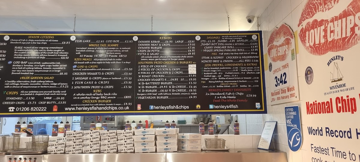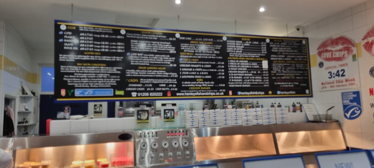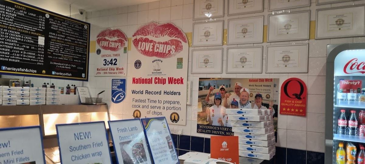 The menu at Henley’s of Wivenhoe offers a variety of dishes catering to different tastes. For fish lovers, there is a selection of options like Plaice, Haddock, SkateRock Eel. Senior citizens can enjoy more affordable options such as Hake, Cod Bap, Fish Cake, Cod Roe, and Whole Tail Scampi. The kebab section includes classic choices like Donner Kebab, Donner Burger, and Chips In Pitta, along with a refreshing Pitta & Salad combo. For those looking for something different, the restaurant also serves Cod & Chips, Chicken Nuggets, Vegetarian Burger, Jumbo Hot Dog, and a delicious Curry Pancake Roll. The wide range of options makes it a perfect spot for anyone craving hearty, comforting meals.