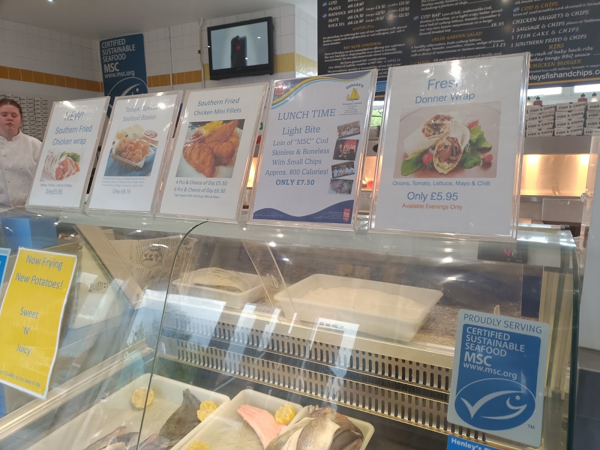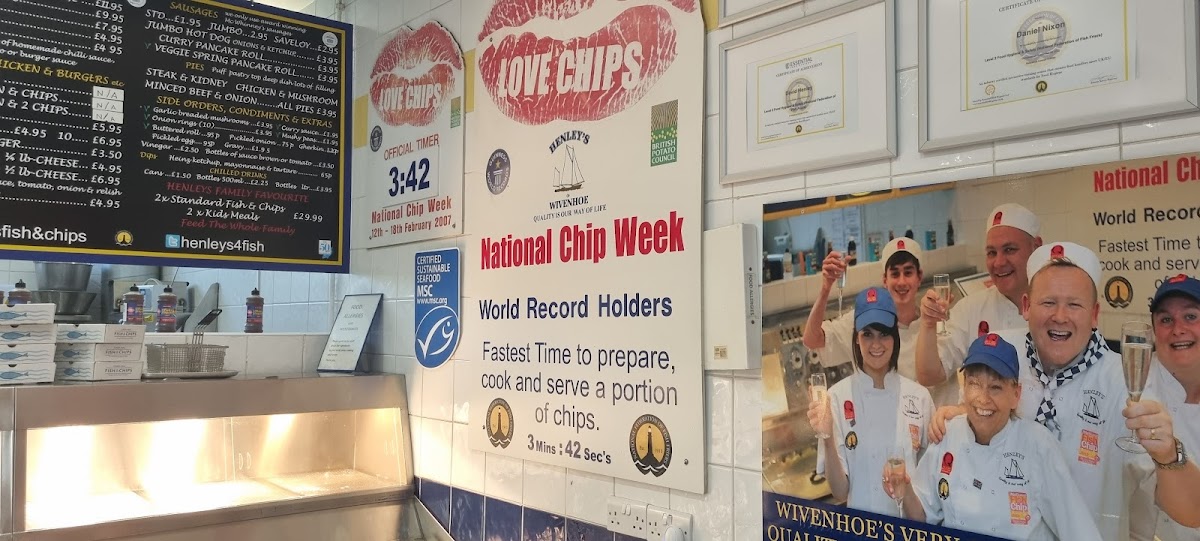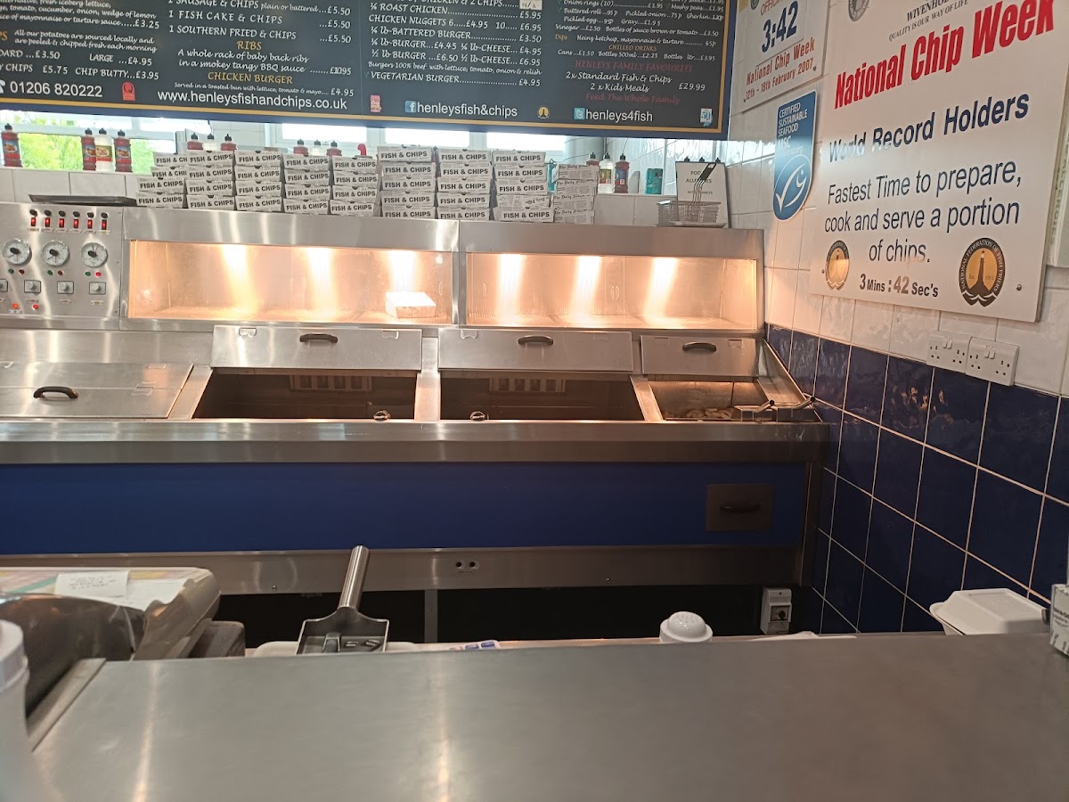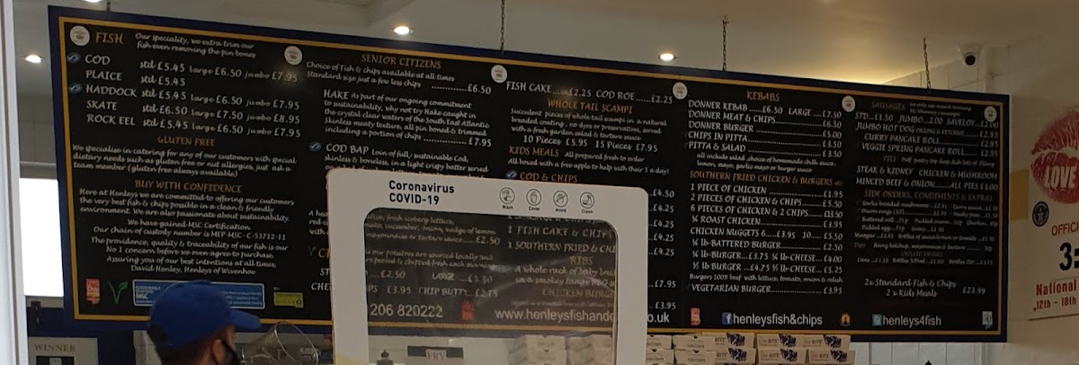 The menu at Henley’s of Wivenhoe offers a variety of dishes catering to different tastes. For fish lovers, there is a selection of options like Plaice, Haddock, SkateRock Eel. Senior citizens can enjoy more affordable options such as Hake, Cod Bap, Fish Cake, Cod Roe, and Whole Tail Scampi. The kebab section includes classic choices like Donner Kebab, Donner Burger, and Chips In Pitta, along with a refreshing Pitta & Salad combo. For those looking for something different, the restaurant also serves Cod & Chips, Chicken Nuggets, Vegetarian Burger, Jumbo Hot Dog, and a delicious Curry Pancake Roll. The wide range of options makes it a perfect spot for anyone craving hearty, comforting meals.